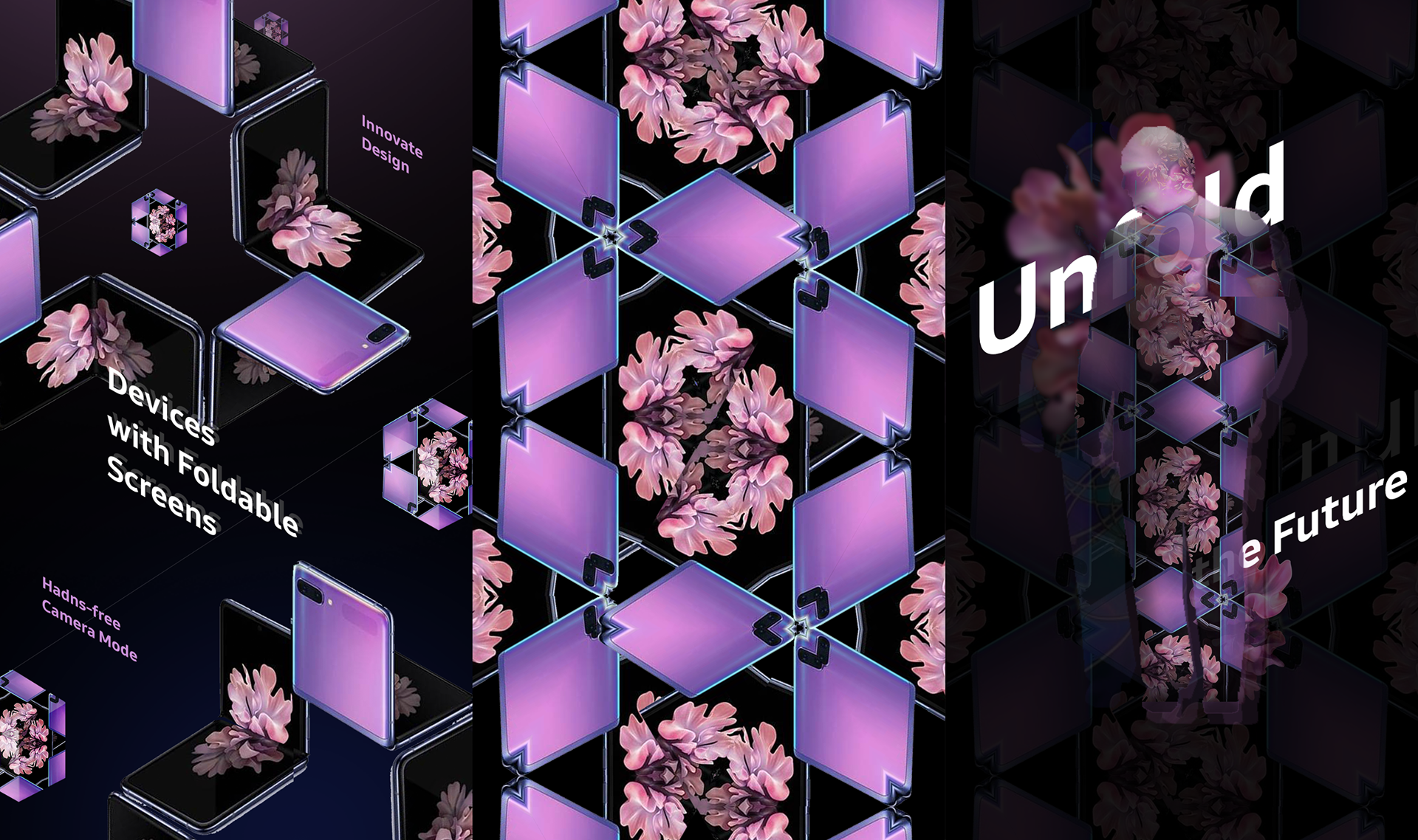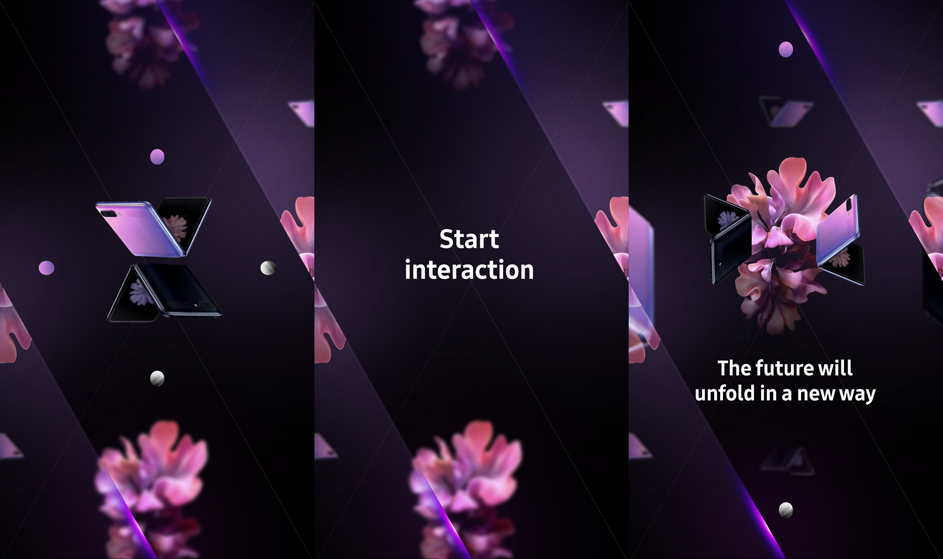 In the main hall of the shopping gallery, a space representing new Samsung products was set up. The task given to me by the advertising agency was to develop an idea for a simple interactive mechanic and style frames that showcase the range of new products.