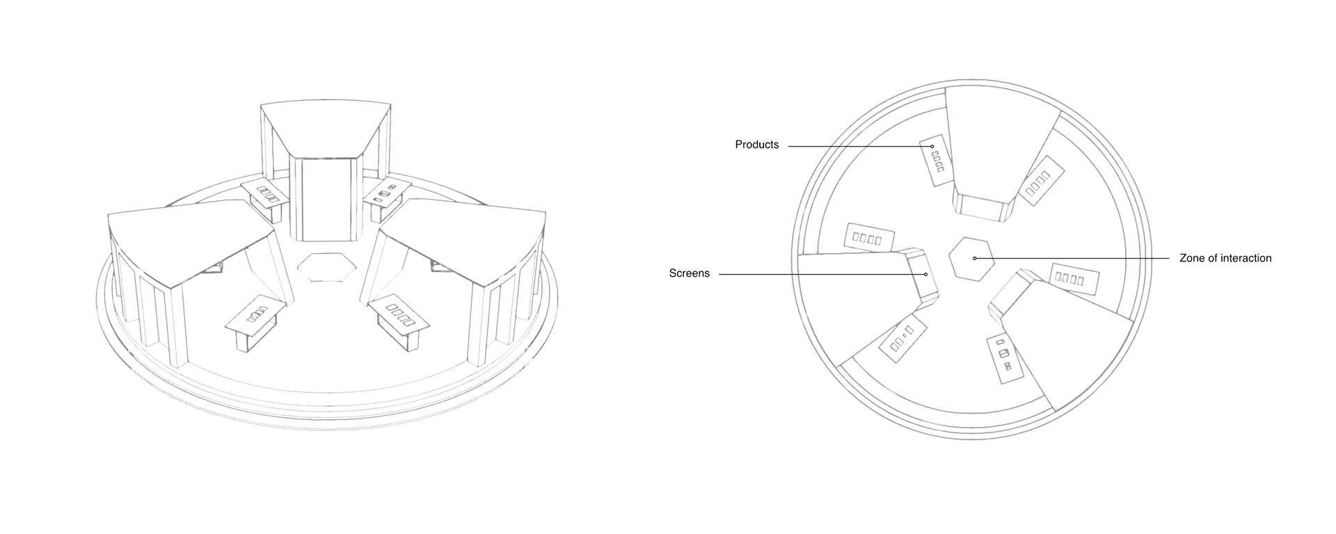 The central area is surrounded by LED displays and depth sensors. Standing in the middle of this zone, the visitor finds themselves inside a virtual space and can control it using gestures.
