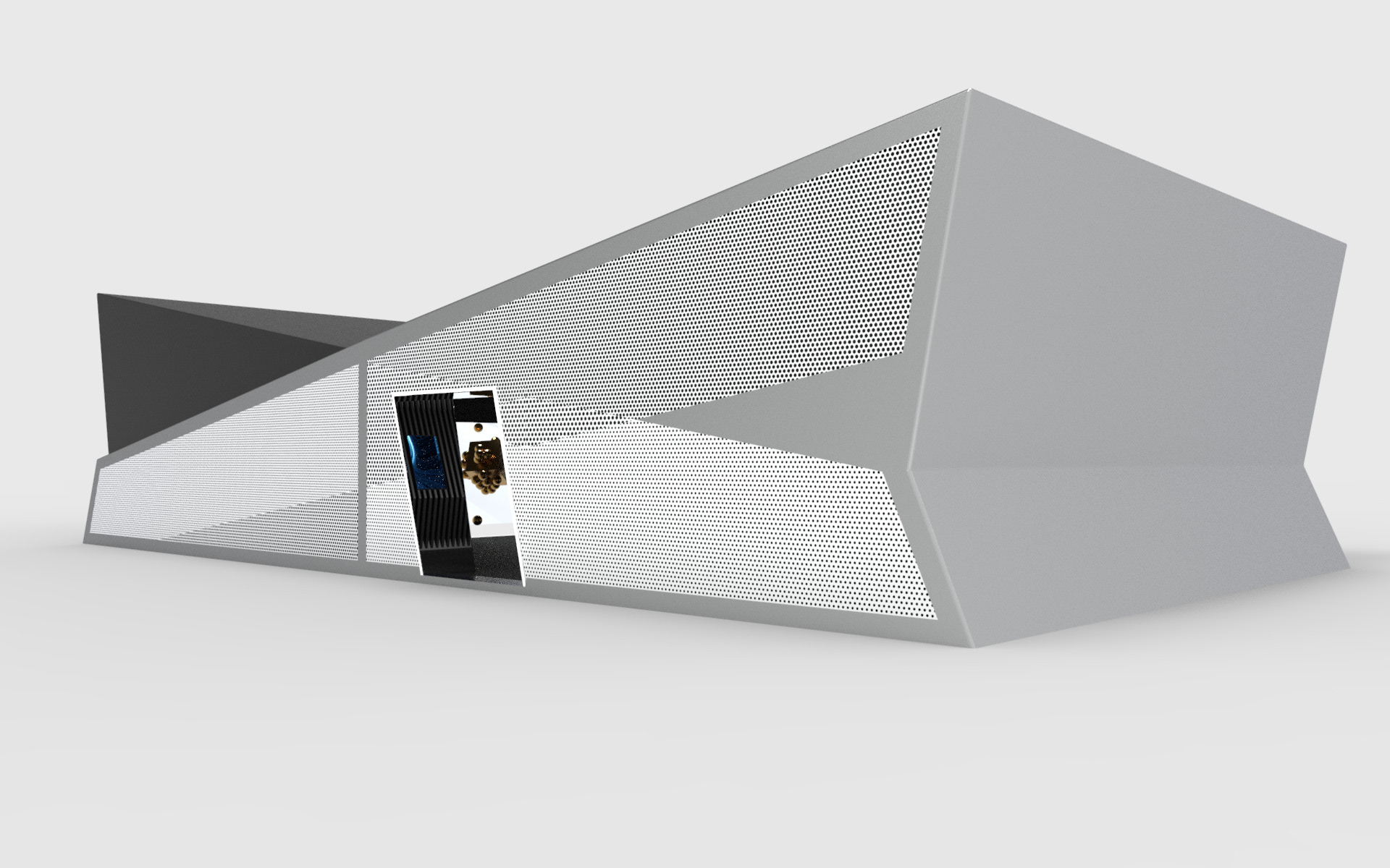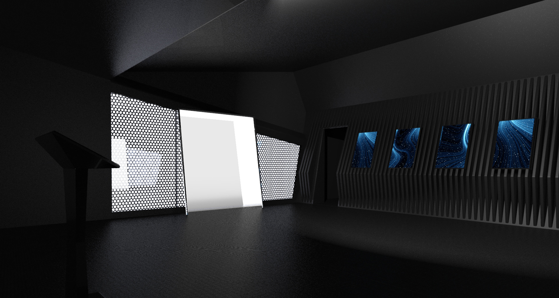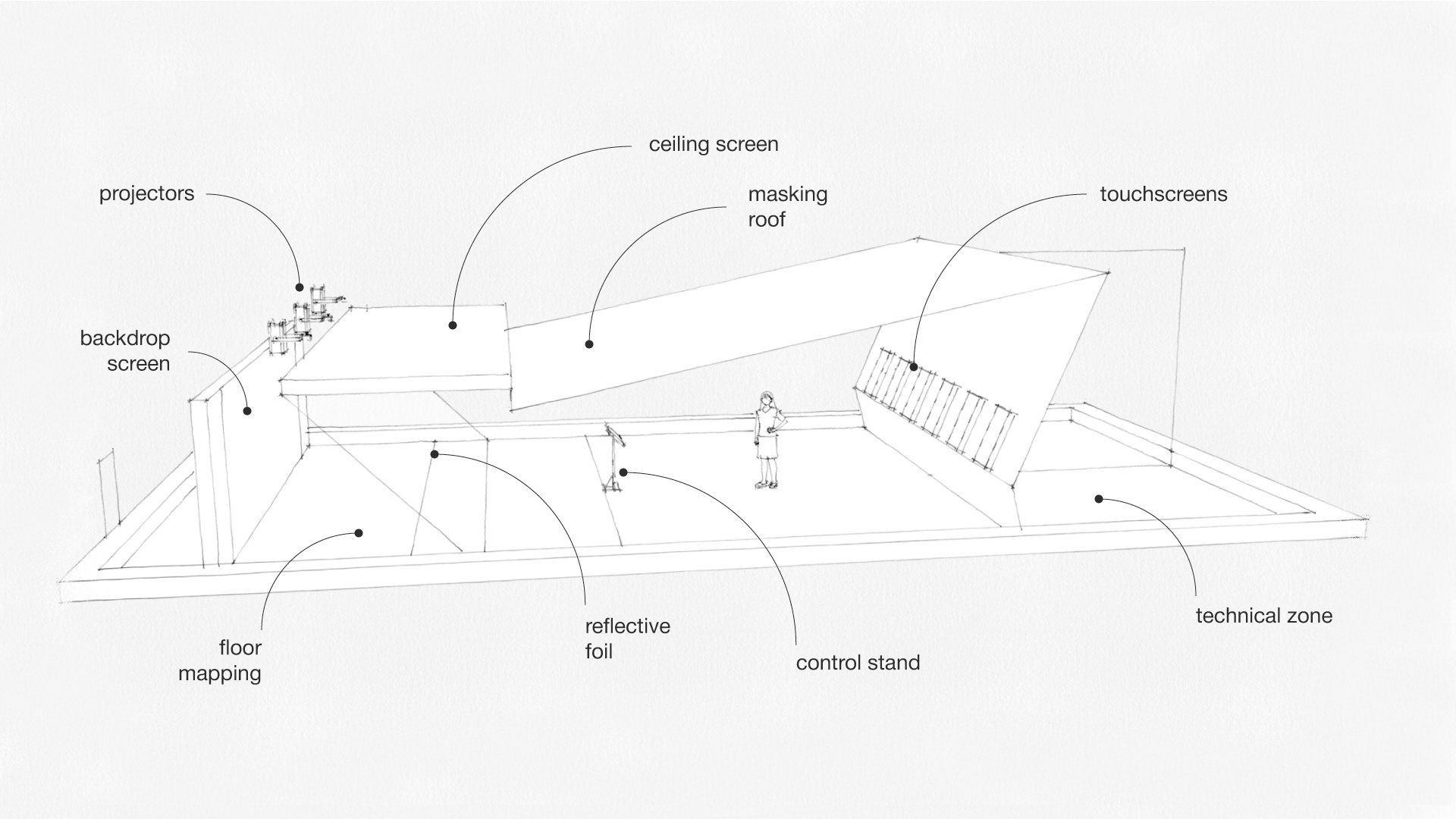 The booth was design from the origin of setup. The form of all inner structures of the mixed reality setup was the main reference for the outer shape of the booth. To mask the LED-screen on the ceiling we decided to make an inclined roof so it looks more natural. All the inside design was make dark to focus spectators attention on the installation itself.