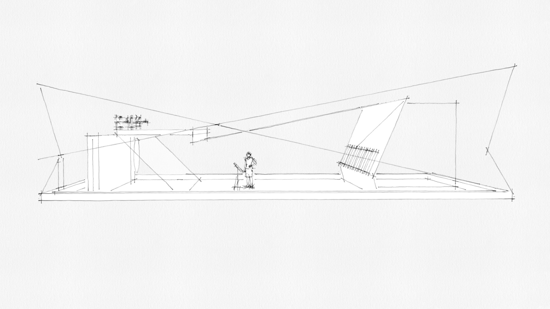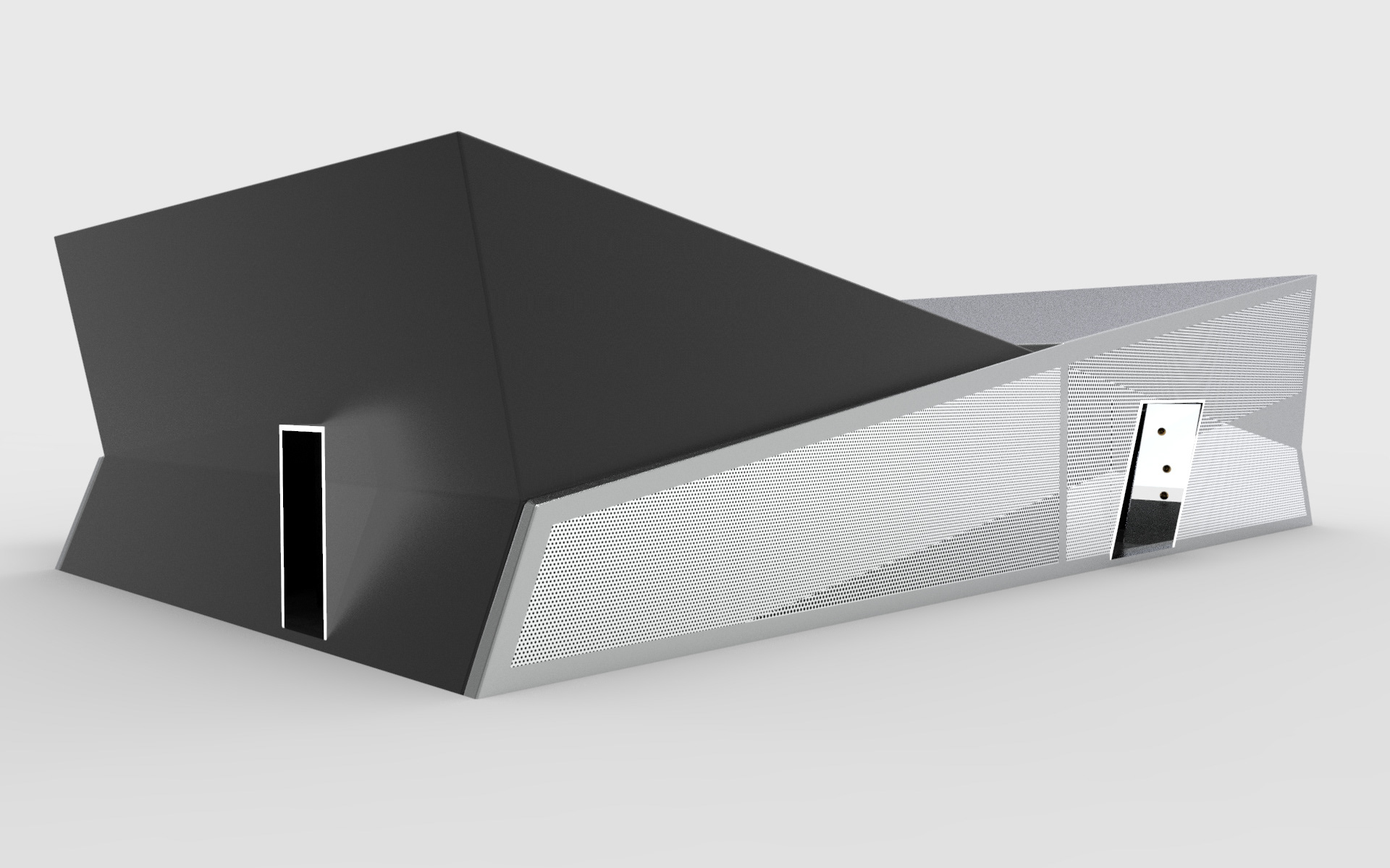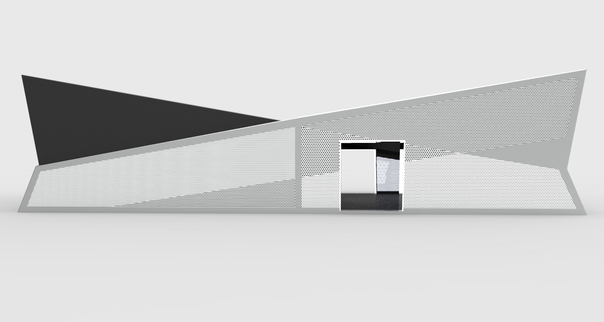 The booth was design from the origin of setup. The form of all inner structures of the mixed reality setup was the main reference for the outer shape of the booth. To mask the LED-screen on the ceiling we decided to make an inclined roof so it looks more natural. All the inside design was make dark to focus spectators attention on the installation itself.