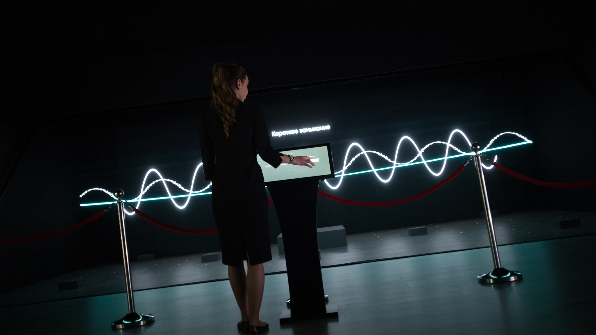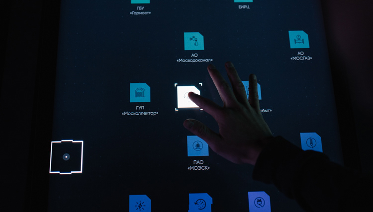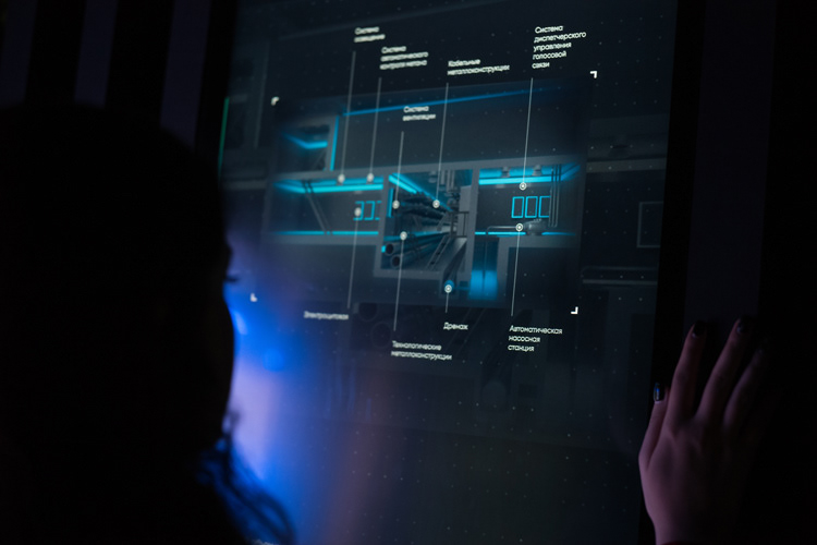 In terms of content, we were faced with the task to visualize rather abstract topics, focusing on the energy policies of the city of Moscow, such as price optimization and energy convergence. We divided the content into eight segments and used individual design approaches and animations for each. For some segments, facts and figures were shifted to the backdrop wall and the hologram showed 3D models. Other segments, spread the visuals across all three layers, creating spatial impressions and 3D animations like bar charts rising from the floor.