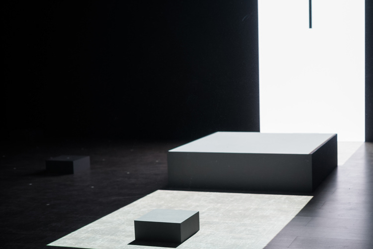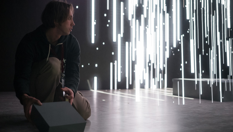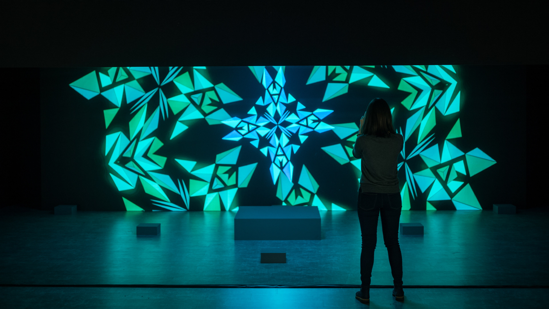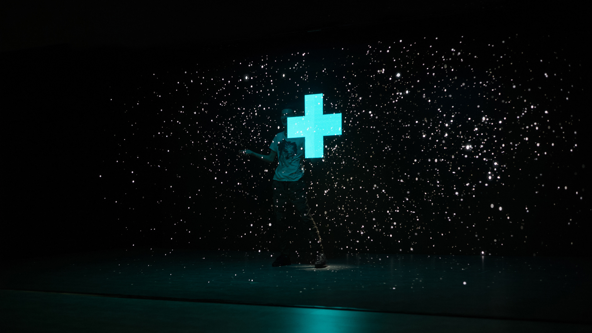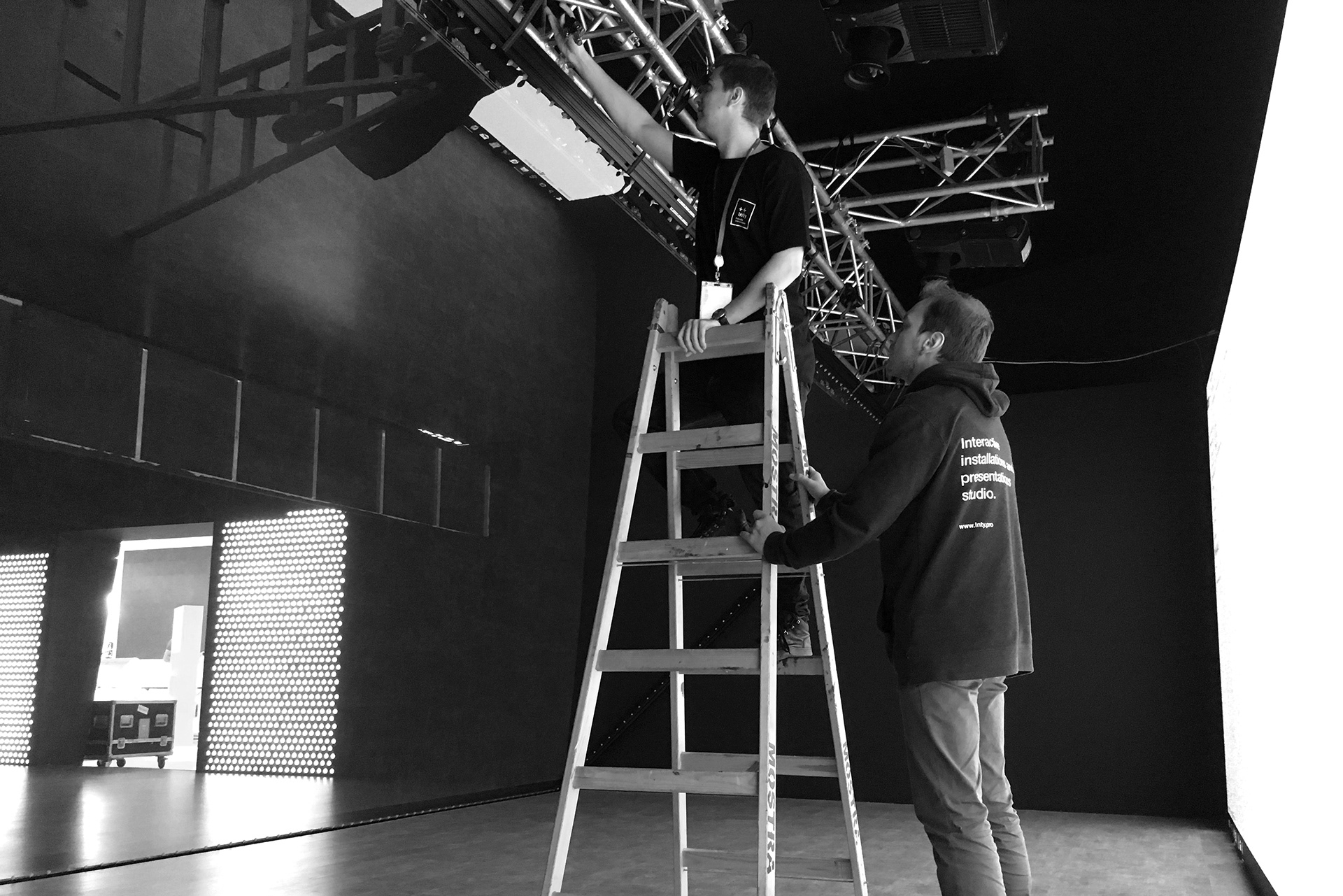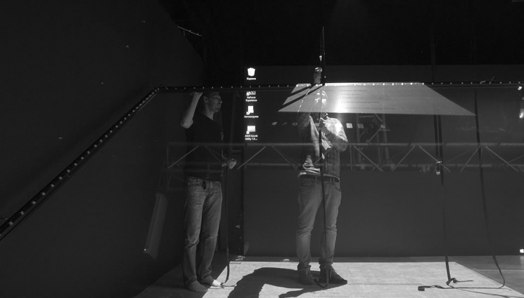 The setup itself consisted of an LED backdrop wall, three projectors for the floor and video wall mounted to the ceiling. Usually the image source is embedded into the floor underneath the foil, but we wanted to have the audience stand on the same level as the hologram. Putting the hologram on an elevated stage would have weakened the illusion.