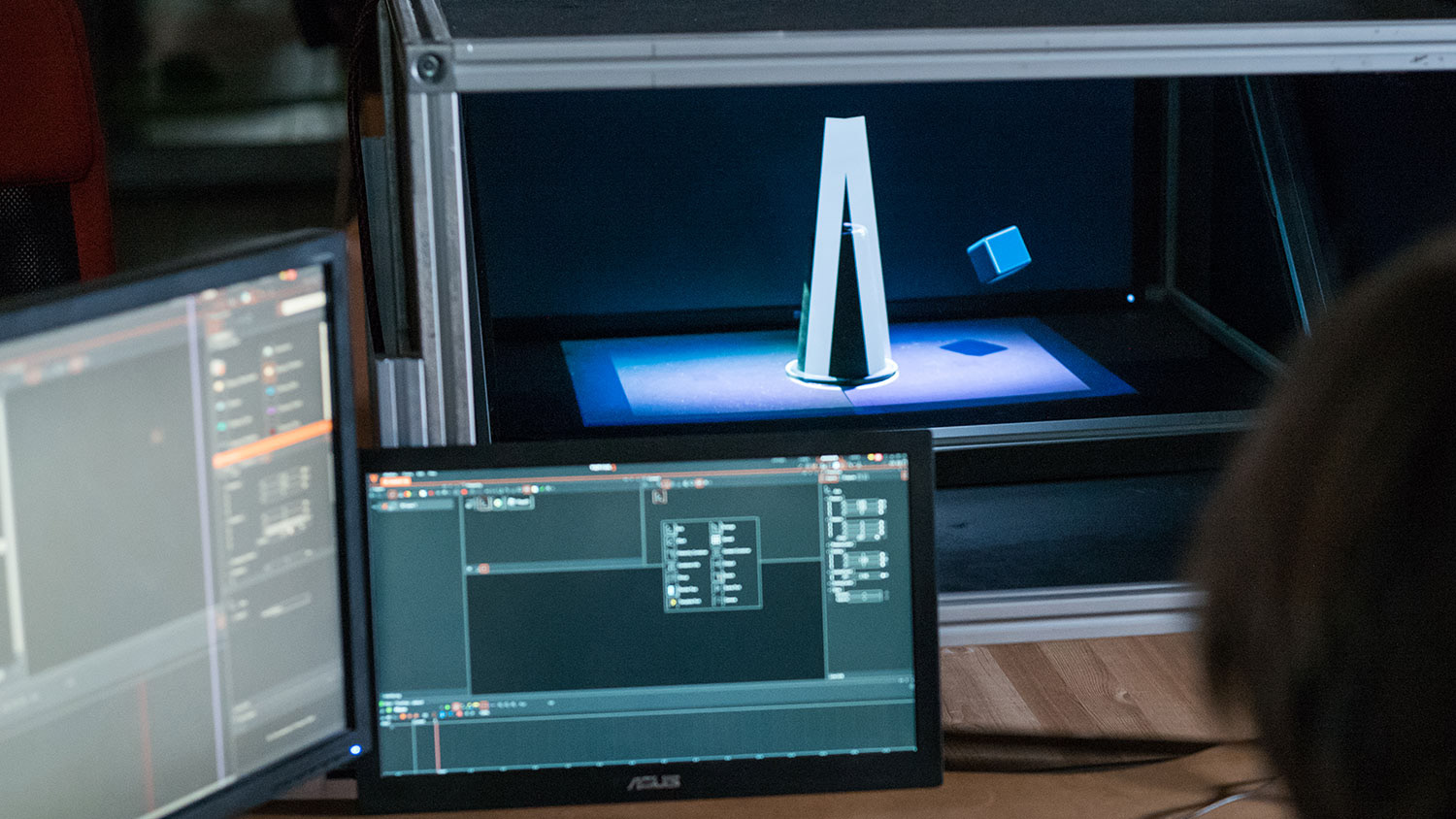 We used the traditional Pepper’s Ghost concept which dates back to the early 19th century. PG is based on the reflection of an image onto glass or foil. Since the transparency of the glass/foil allows the viewer to still see everything behind the reflected image, it appears to be floating in mid-air.