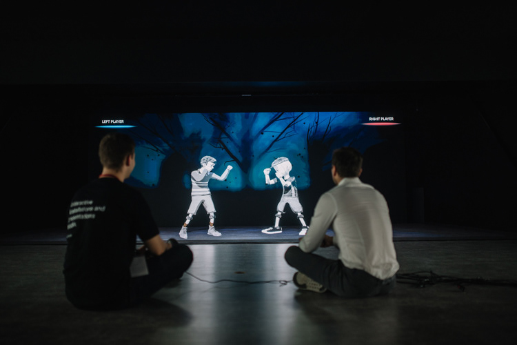 To get some more visual inspiration we tried out different graphic sketches with particels, color patterns and shapes within the night when the exhibition was closed. We came up with the idea of holographic fighting game with realtime shadows and tried our betta version made in Unity.