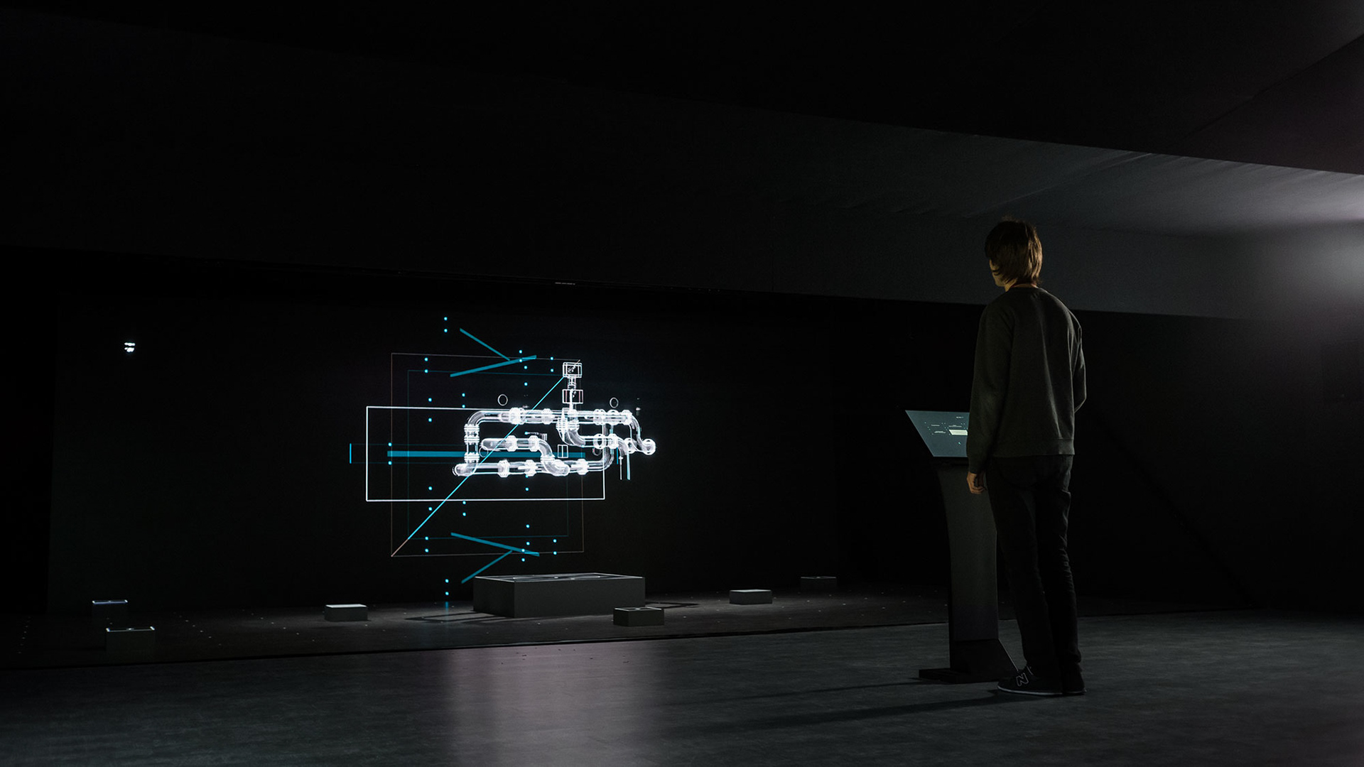 This is especially true if one looks at the purpose of the projectors. On the one hand they gave the opportunity to extend animations from the backdrop wall via the floor onto the holographic foil, thereby transcending from display into holography. On the other hand, they added plasticity to the hologram by providing it with an animated shadow – a simple idea that made all the difference.