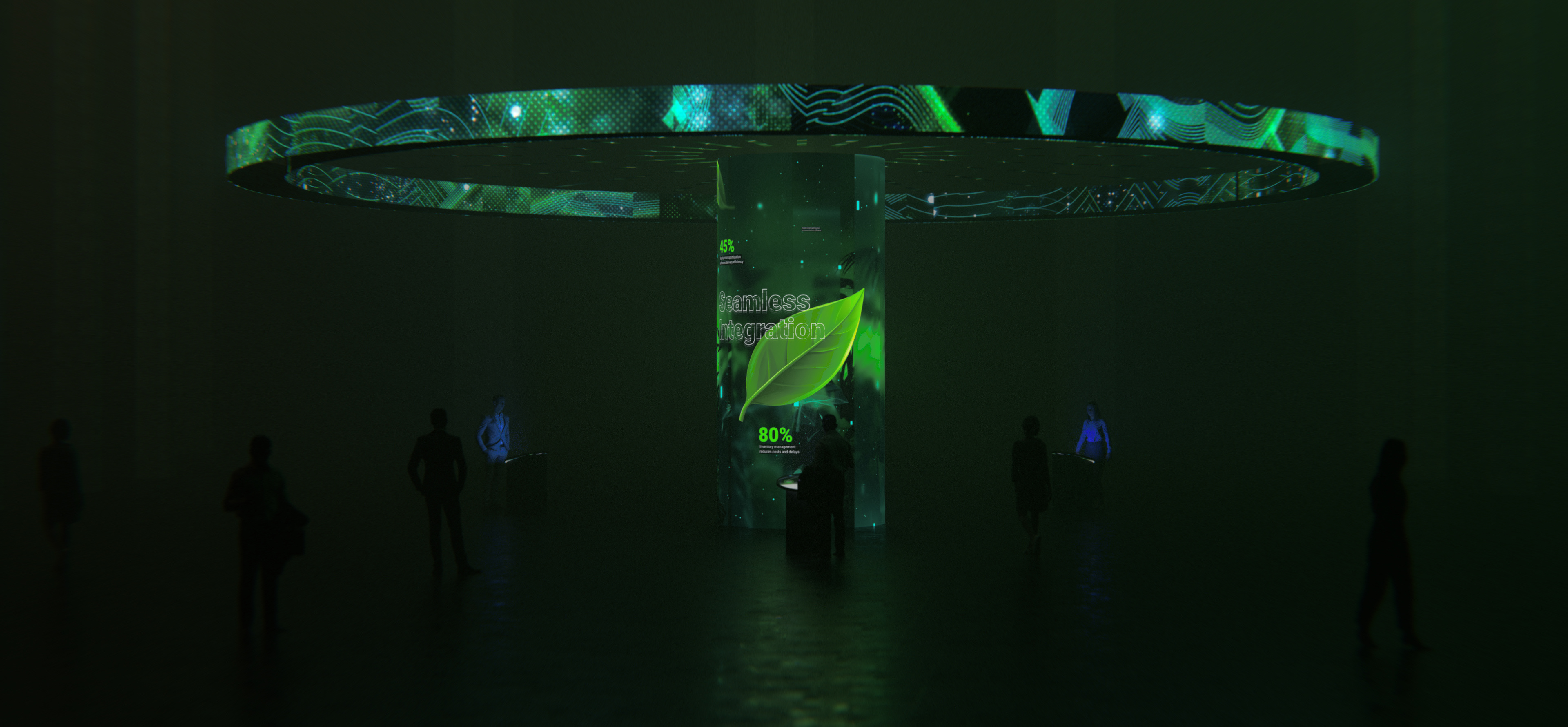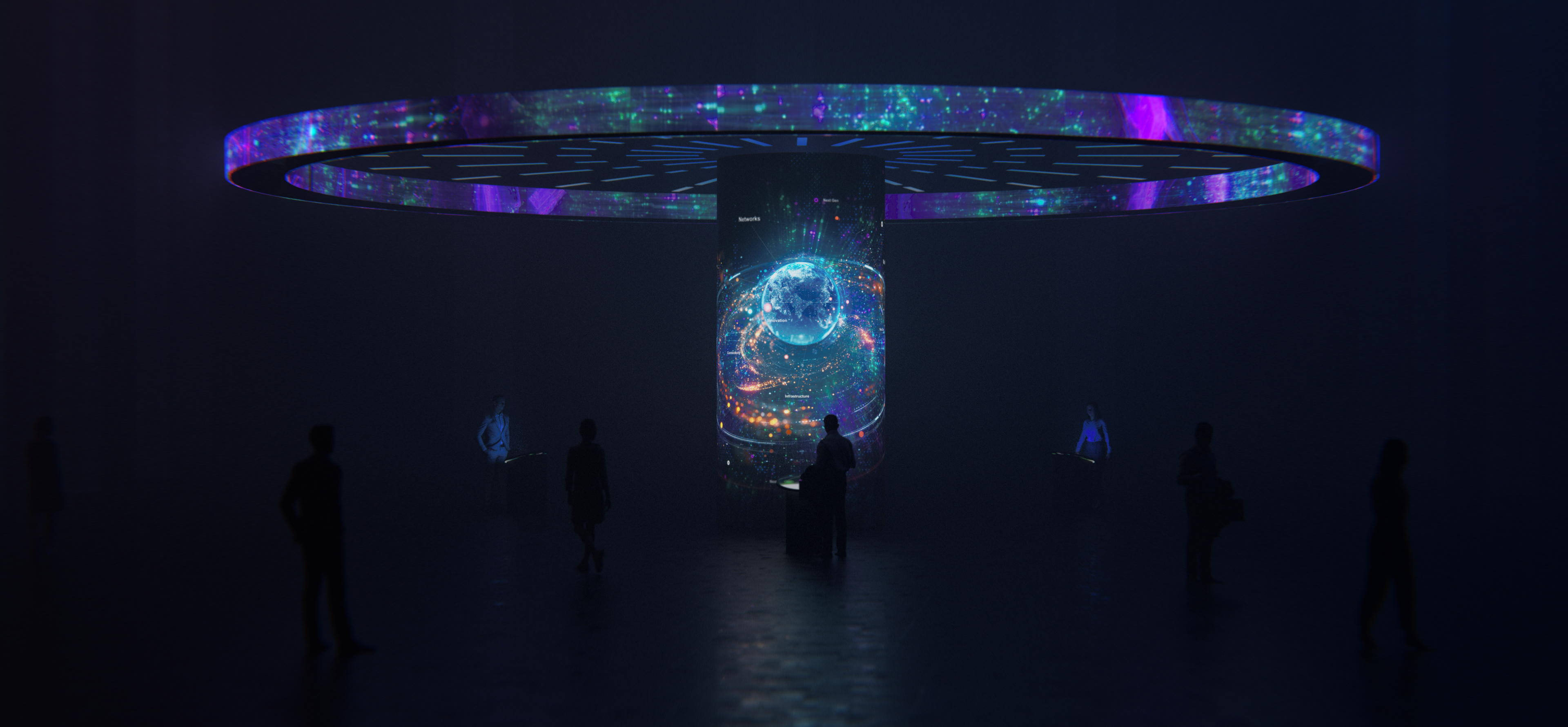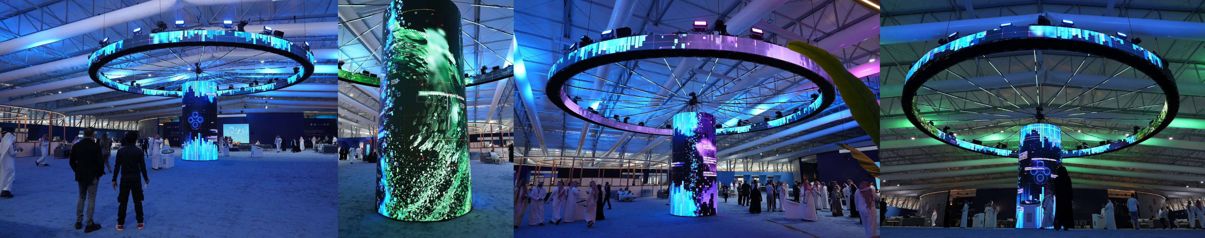 The Tree Digital Sculpture blends technology and art, featuring a cylindrical digital column, a LED canopy, and interactive circular screens. Inspired by the shape of a tree, it symbolizes growth, connection, and the seamless fusion of technology.