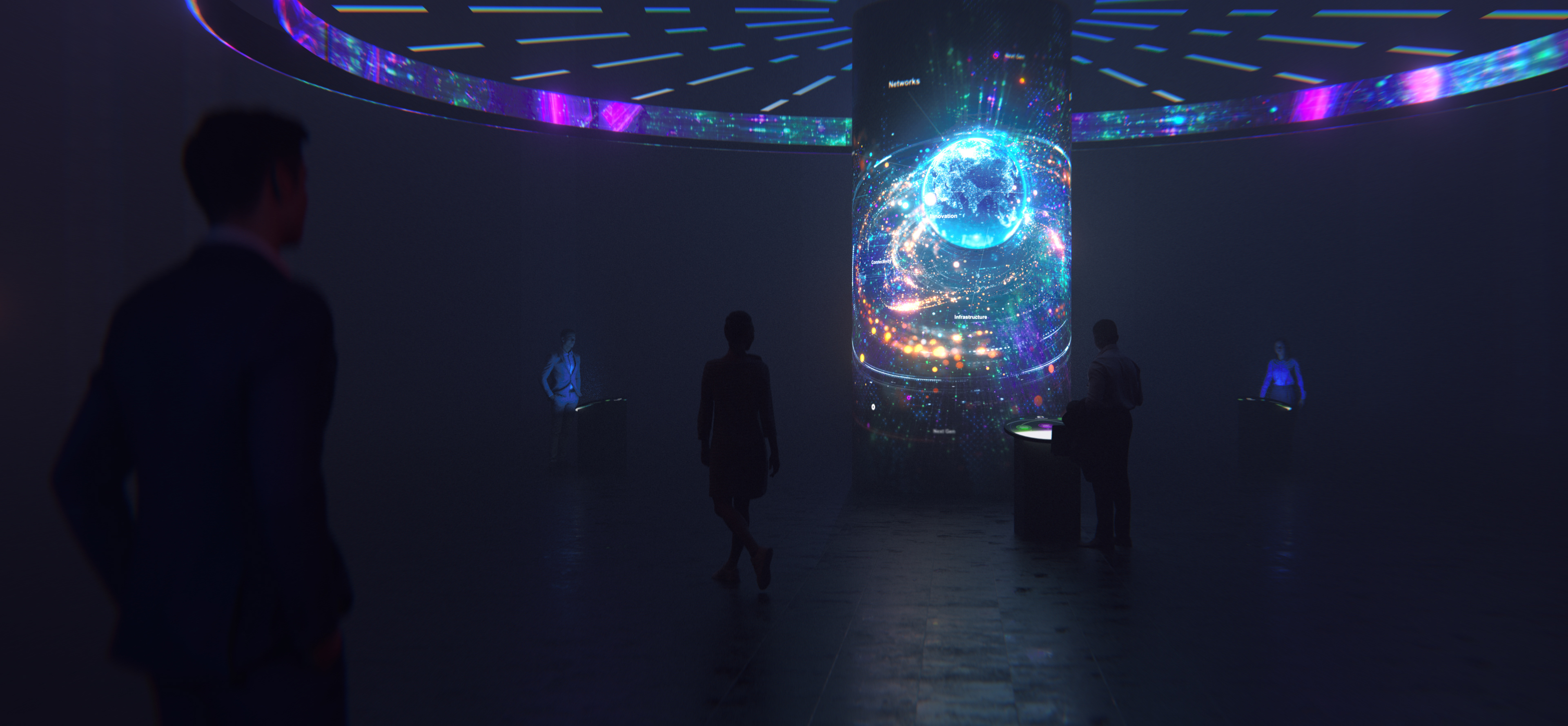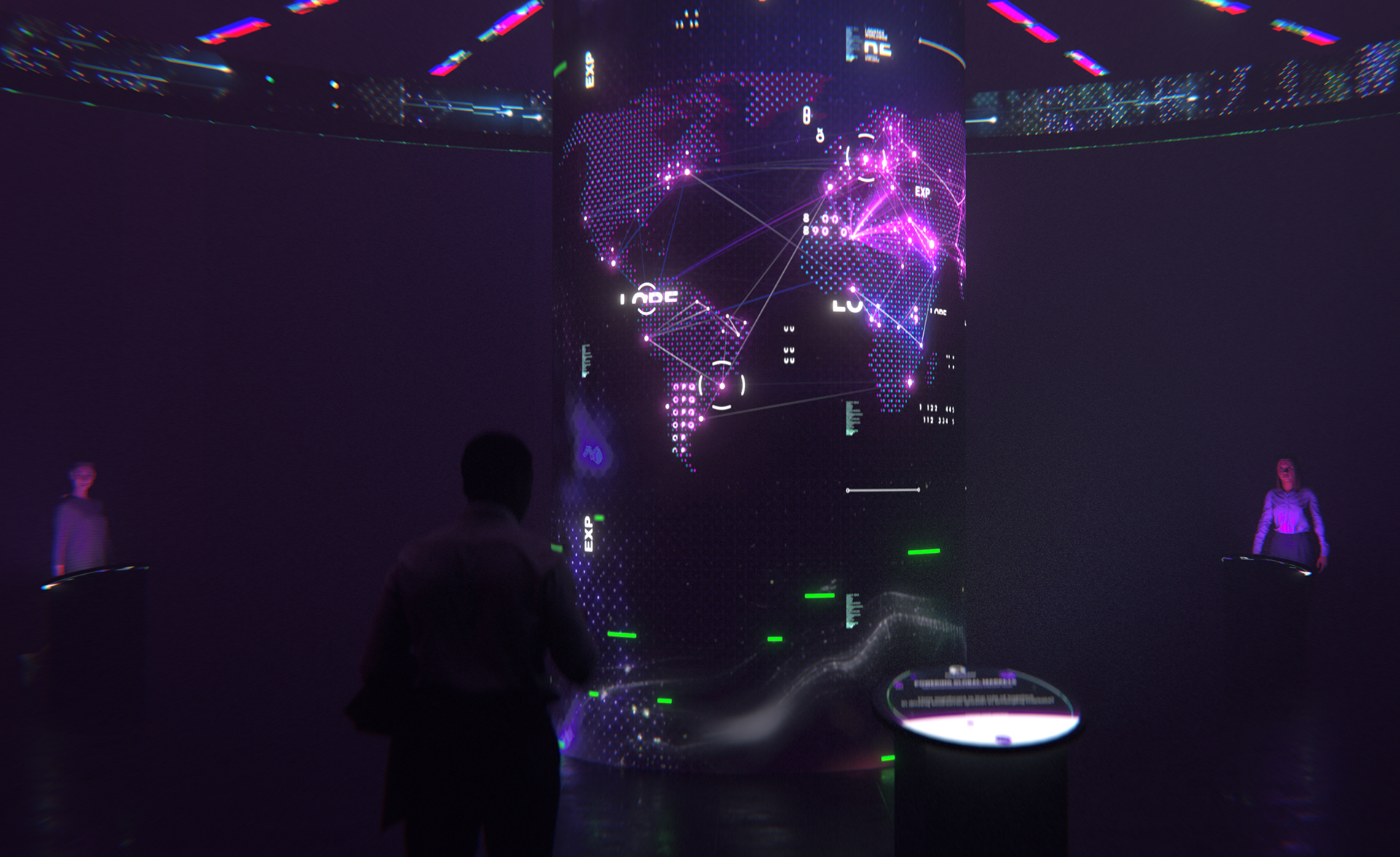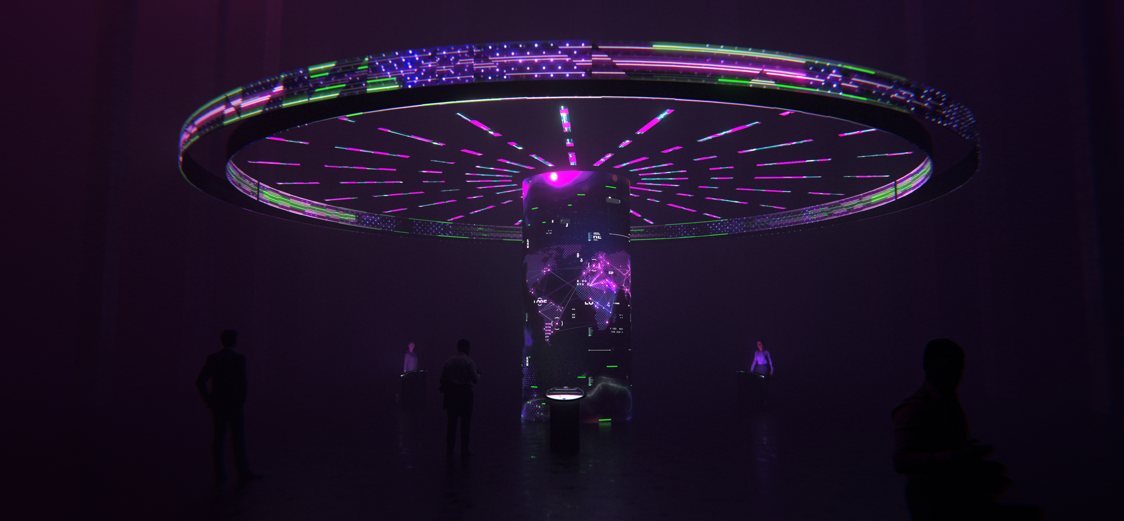 By interacting with the sculpture, users can access business-related information. The circular screens serve as an intuitive interface, allowing users to explore various sections, while the main digital column displays key data and visuals.