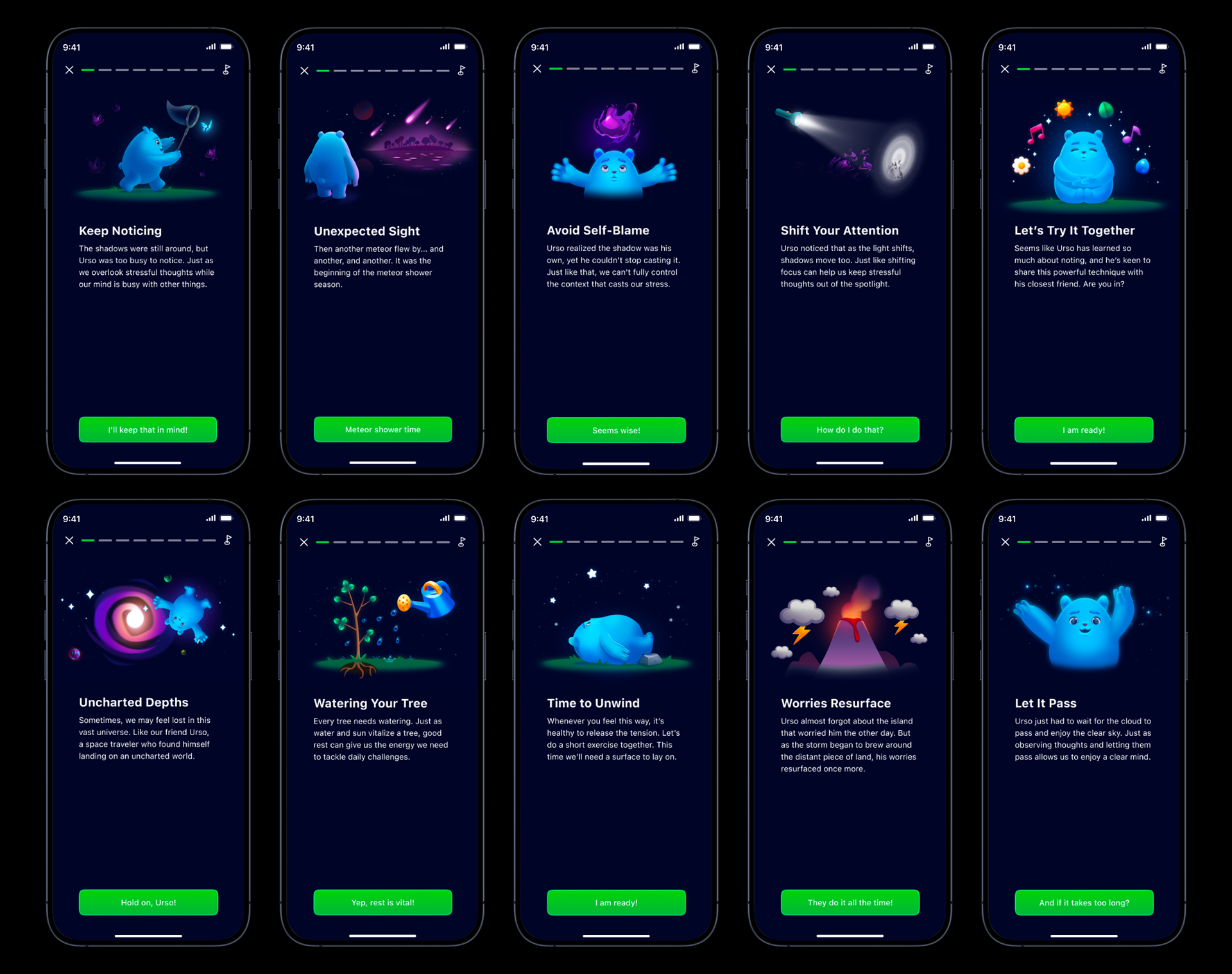 We crafted an easy-to-follow onboarding experience that swiftly immerses users in Urso's world, core gameplay, and essential mechanics. By intertwining mindfulness cultivation with gamification, players remain motivated and engaged on their transformative journey towards self-improvement.