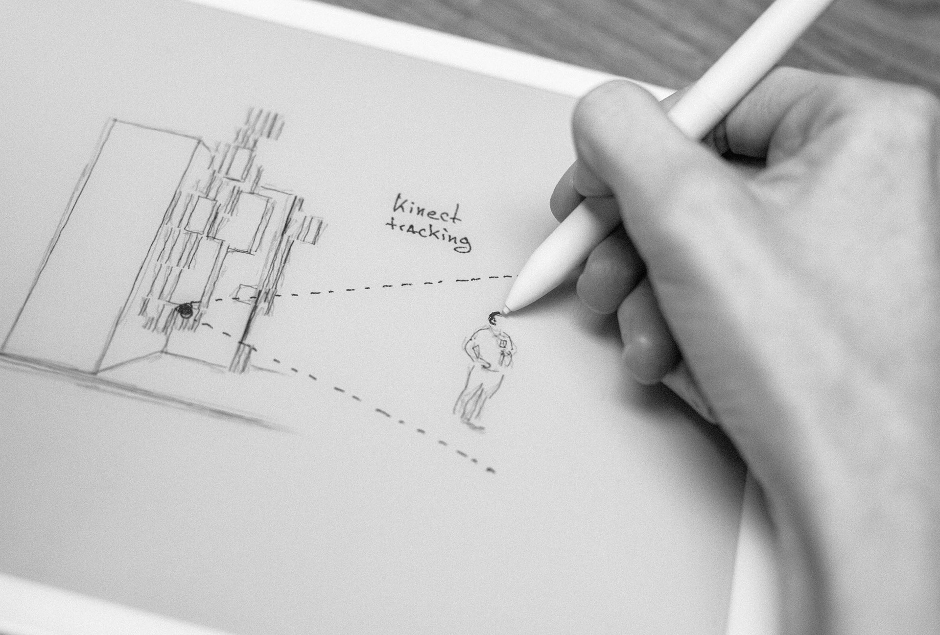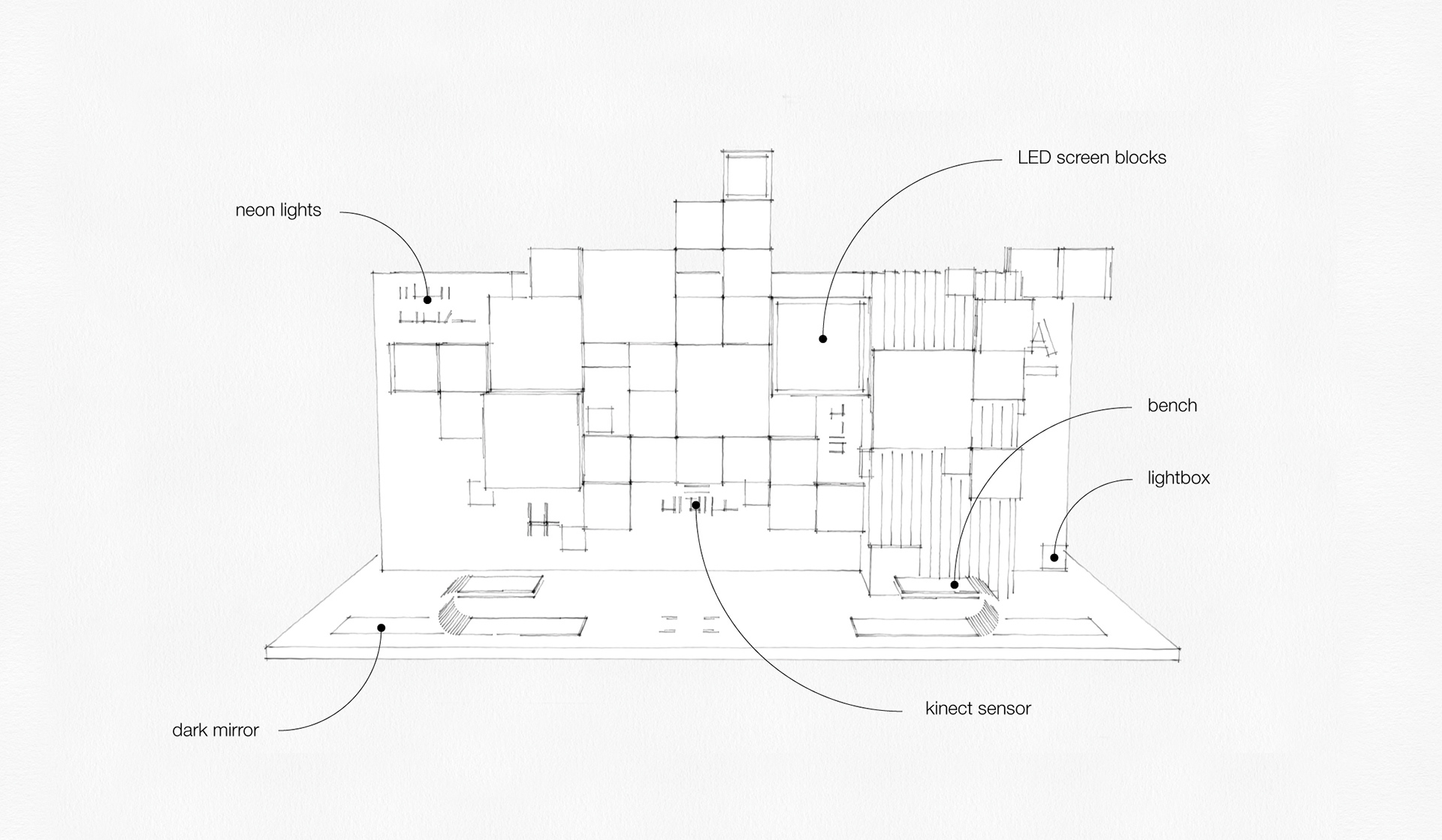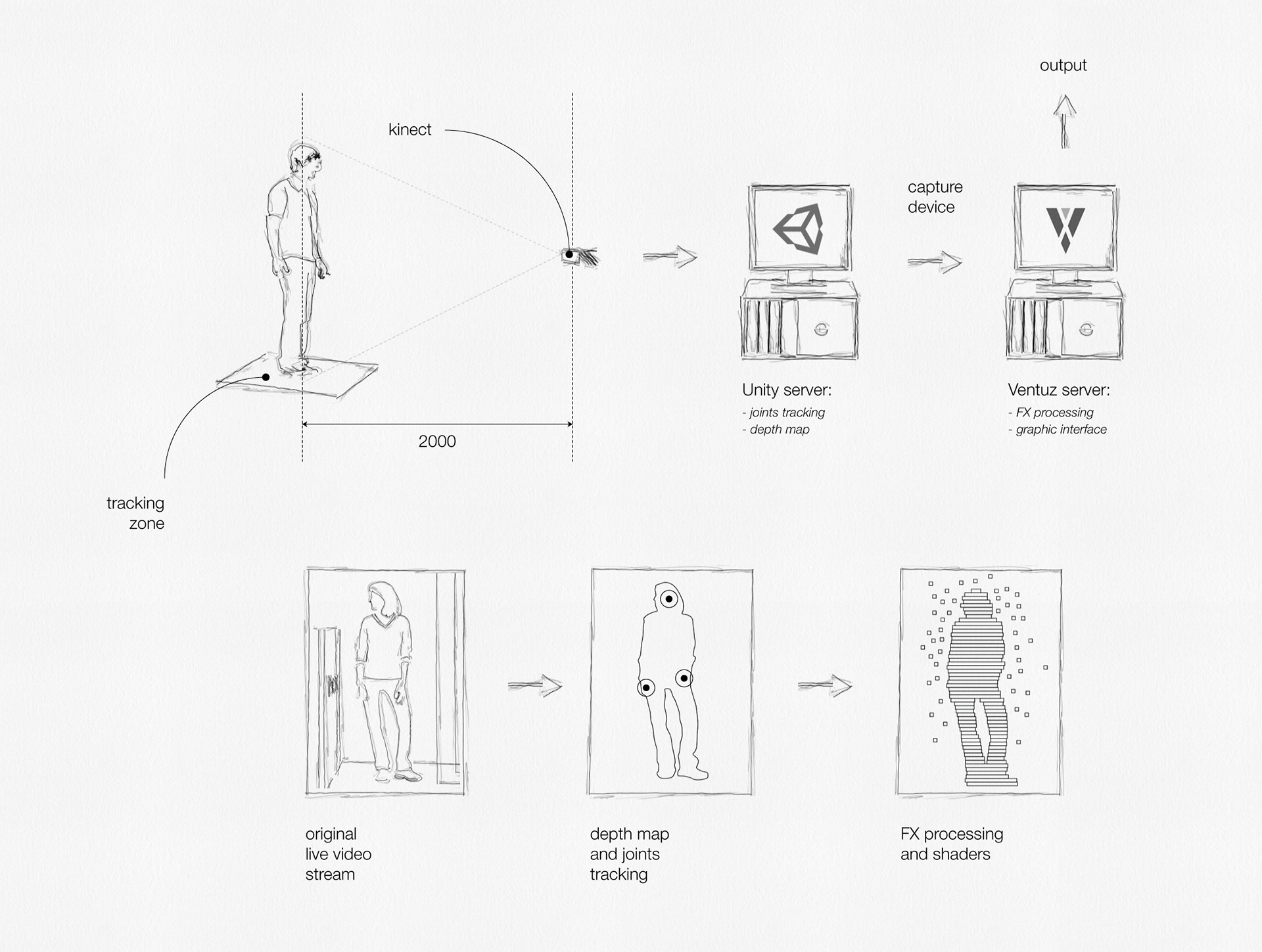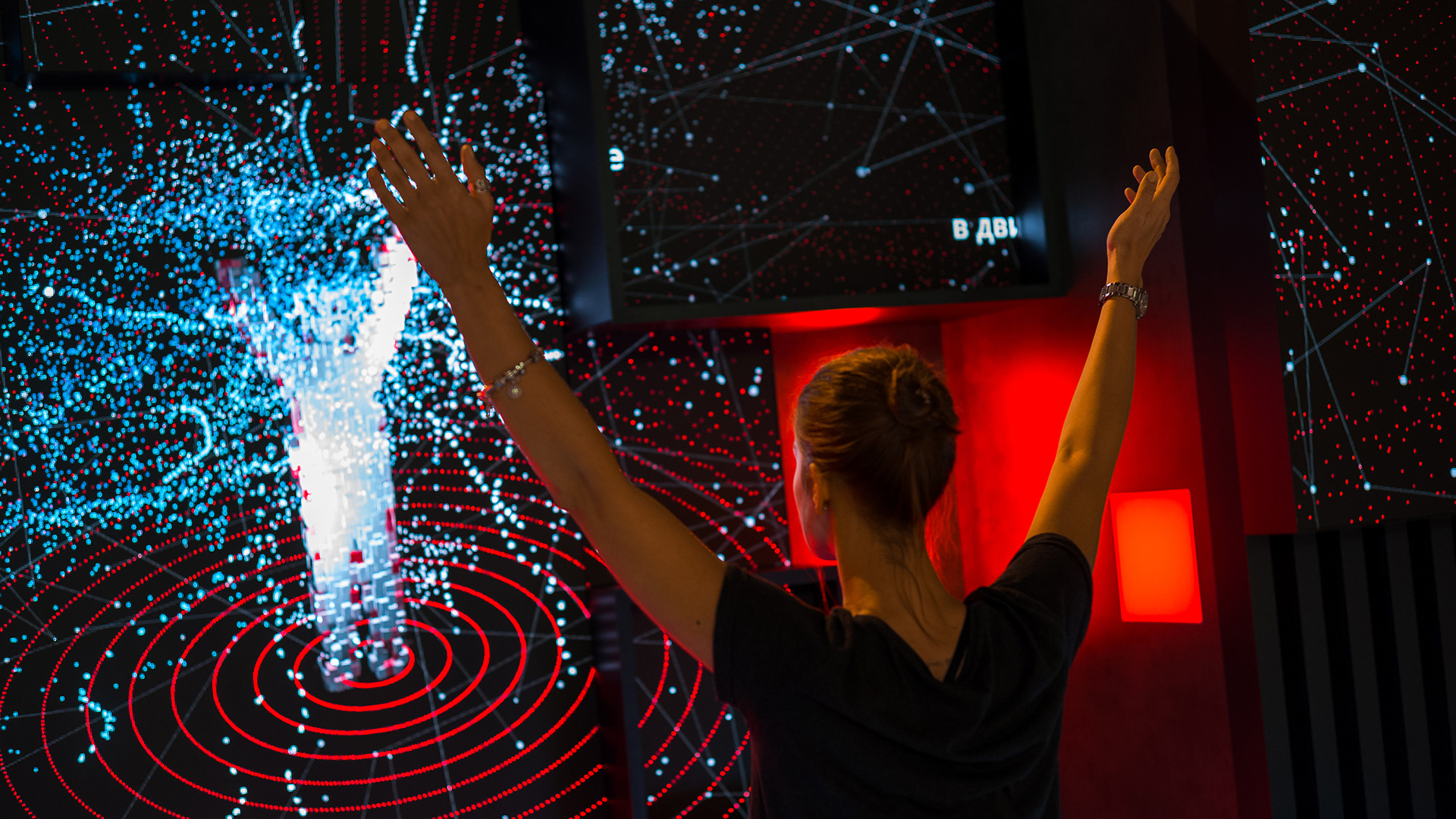 Every vision was constructed around the guest’s digitized avatar, communications the main message - future is impossible without actions, we do not know, where future lies, but we are the ones to create it. To deliver this effect we used a depth camera, scanning the person in realtime. The resulting data created a digital onscreen avatar. The feeling of involvement, immersion, a shift from rational to emotional shaped the experience.