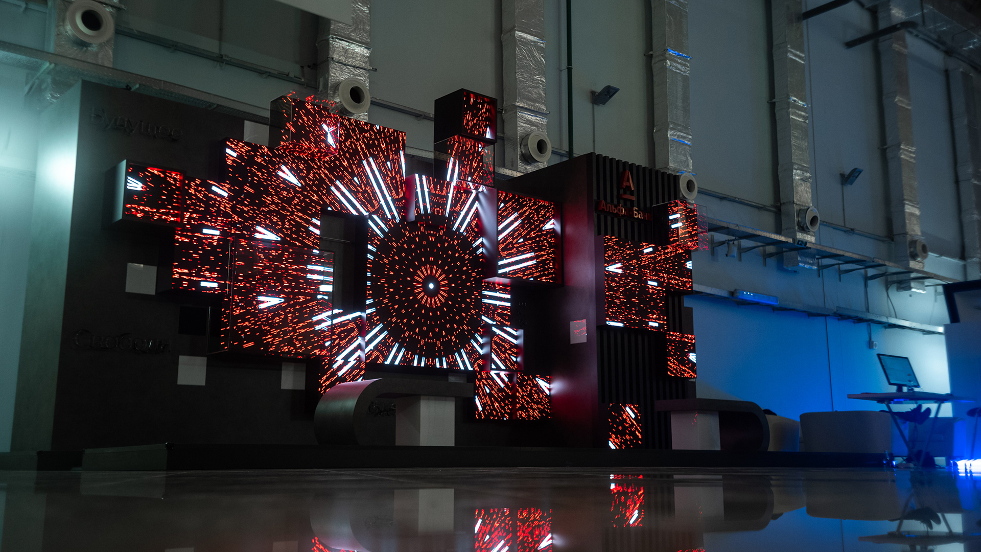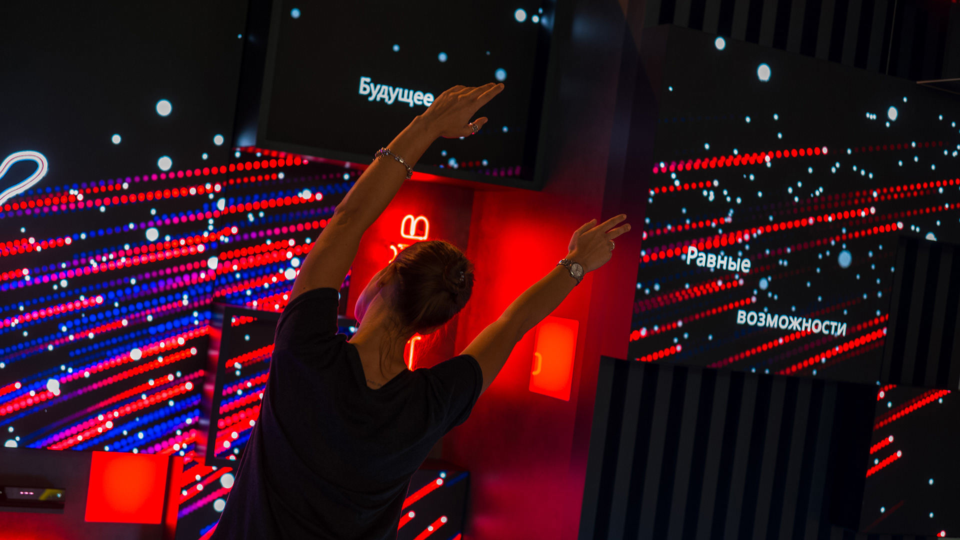 The key to bring the visions of future to life is a person, curiosity of a human mind, one’s actions. An urge to advance manifested in the act of motion. Future shaped by technology and brought to life with guest’s movements. We have created three visions for that - A world with new speeds of transactions, data, transportation; A world with new means of communication security and trust; A world, seen through the sensors of smart machines.